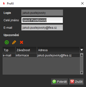 Pod kolonkou upozornění můžete tak spravovat všechny aktuálně zadané adresy kam systém dohledu alarmy posílá.
