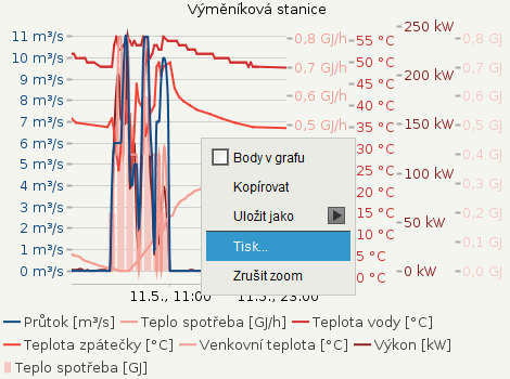 Pro nastavení zobrazeného období slouží menu nad grafem. Pro interval zobrazení slouží kombobox Pohled, kde je možný výběr den/týden/měsíc/rok. Po změně intervalu se přepočítá graf i statistiky.