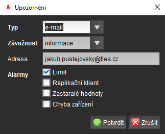 Alarmy - Zde si uživatel zaškrtne jaké třídy alarmů mohou posílat na danou adresu zprávy.