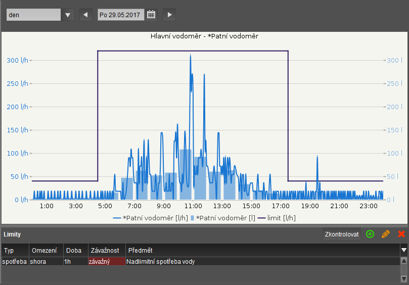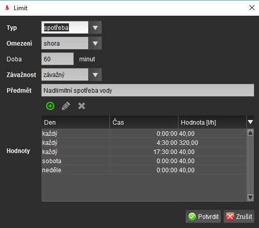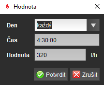 V tomto případě je nastaven limit spotřeby tak, že každý den od 4:30:00 se může spotřeba z 40 l/h navýšit až na 320l/h a to do 17:30:00h. Poté se limit opět sníží na hranici 40 l/h.