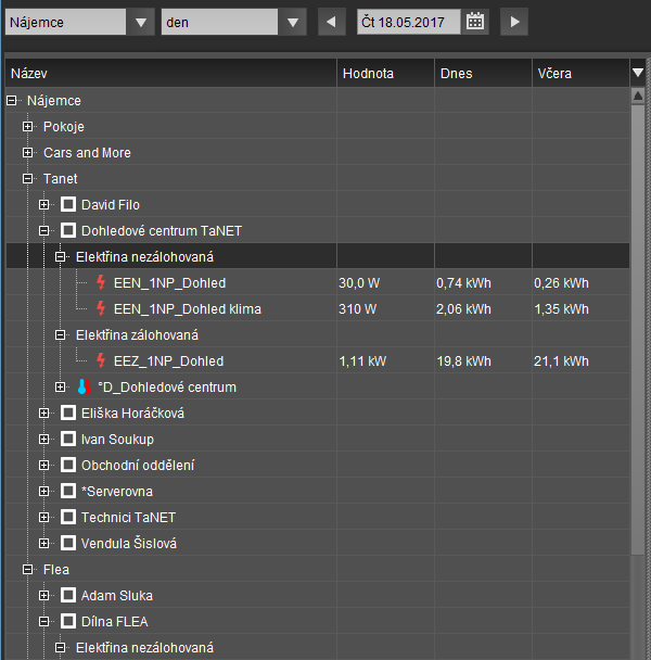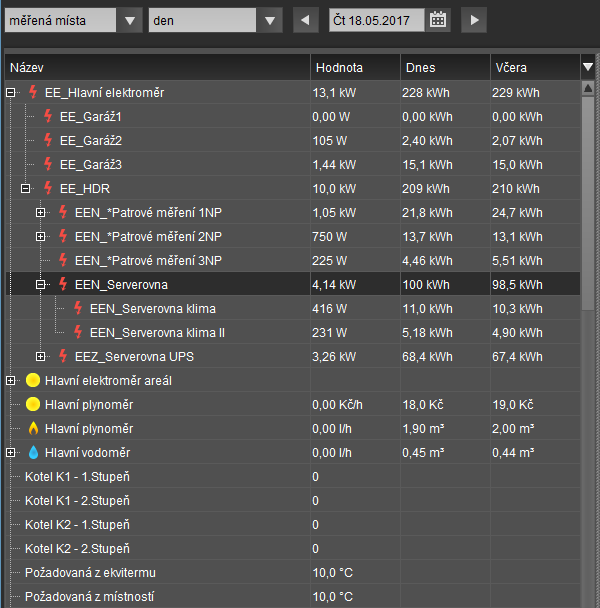 Po výběru dané instalace se zobrazí seznam hlavních měřených míst v rámci dané instalace s grafy průběhu spotřeby a statistiky.